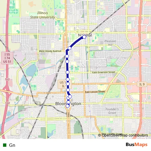 The first stop of the Gn bus route is Downtown Bloomington Transfer Center and the last stop is Uptown Station. Gn is operational during todos los días.