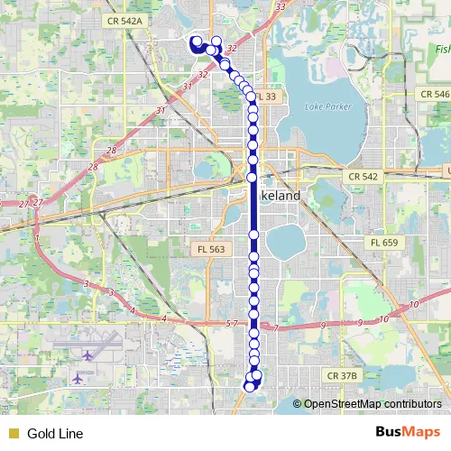 The first stop of the Gold Line bus route is Gow B. Fields Park & Ride @ US 98 N and the last stop is Lake Miriam Shopping Center. Gold Line is operational during todos los días.