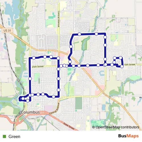 The first stop of the Green bus route is Columbus Transit Depot and the last stop is Columbus Transit Depot. Green is operational during todos los días.