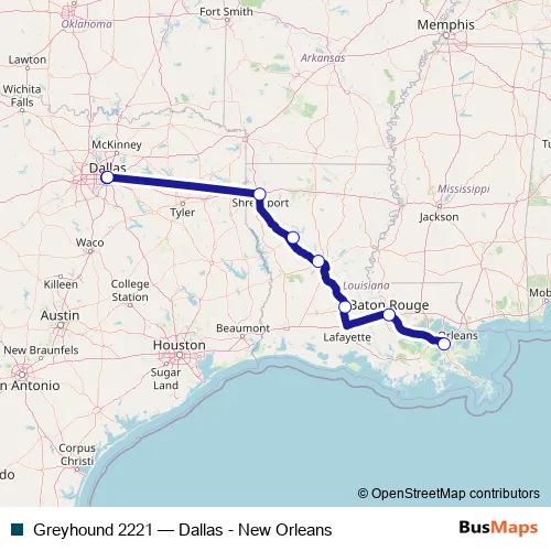 Click here to view the nearest Greyhound 2221 - Dallas - New Orleans bus stop.