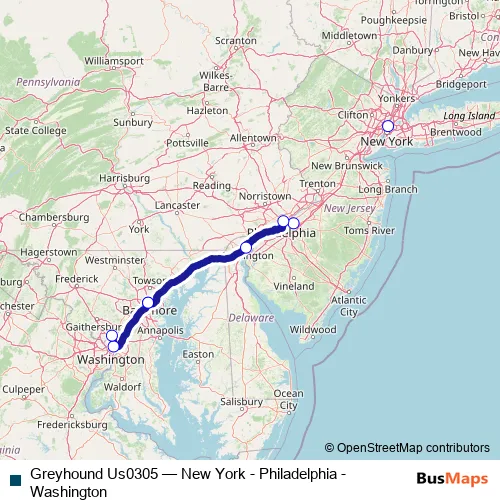 Click here to view the nearest Greyhound Us0305 - New York - Philadelphia - Washington bus stop.