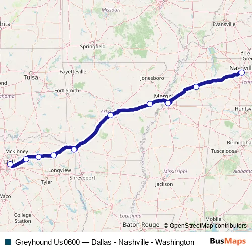 Click here to view the nearest Greyhound Us0600 - Dallas - Nashville - Washington bus stop.