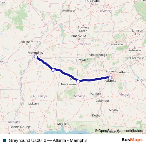 The first stop of the Greyhound Us0610 bus route is Atlanta Bus Station and the last stop is Memphis Bus Station. Greyhound Us0610 (Atlanta - Memphis) is operational during todos los días.