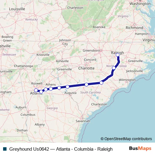 The first stop of the Greyhound Us0642 bus route is Raleigh Bus Station and the last stop is Atlanta Bus Station. Greyhound Us0642 (Atlanta - Columbia - Raleigh) is operational during todos los días.