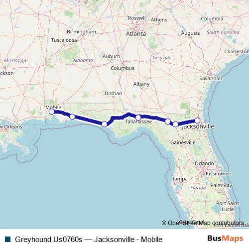 Click here to view the nearest Greyhound Us0760s - Jacksonville - Mobile bus stop.