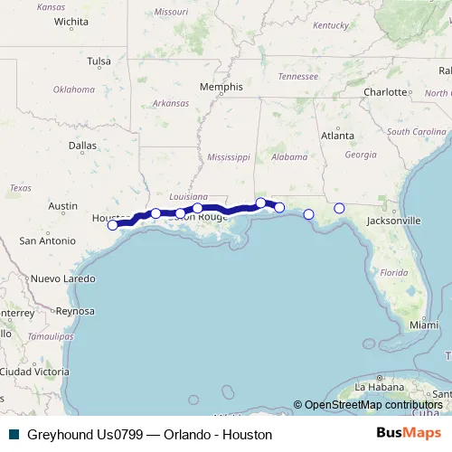 Click here to view the nearest Greyhound Us0799 - Orlando - Houston bus stop.