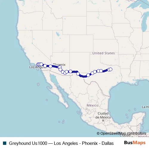 The first stop of the Greyhound Us1000 bus route is Los Angeles Union Station and the last stop is Dallas Bus Station. Greyhound Us1000 (Los Angeles - Phoenix - Dallas) is operational during todos los días.