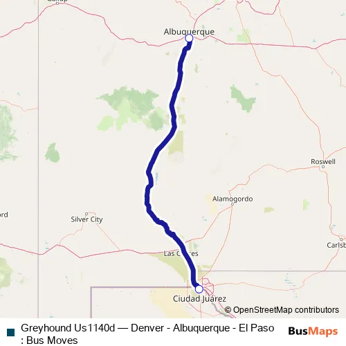 The first stop of the Greyhound Us1140d bus route is El Paso Bus Station (W San Antonio St) and the last stop is Albuquerque Bus Station. Greyhound Us1140d (Denver - Albuquerque - El Paso : Bus Moves) is operational during todos los días.