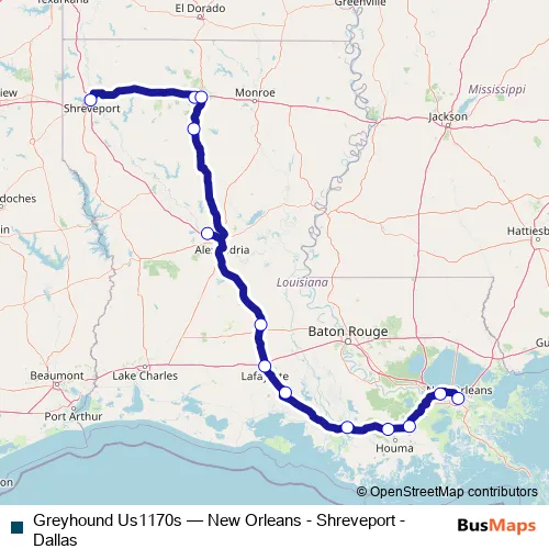 The first stop of the Greyhound Us1170s bus route is Shreveport Bus Station and the last stop is New Orleans Bus Station. Greyhound Us1170s (New Orleans - Shreveport - Dallas) is operational during todos los días.