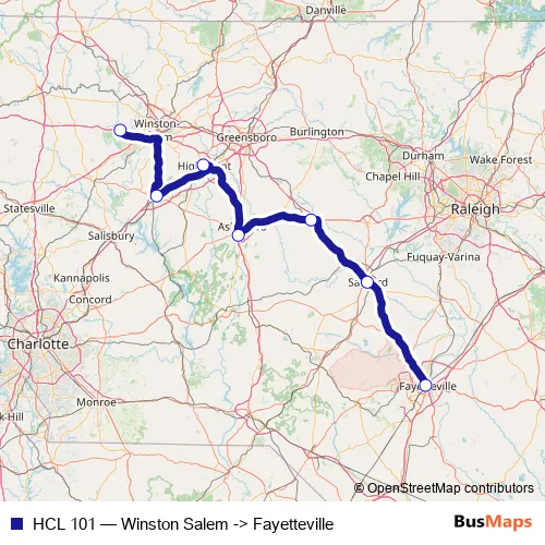 The first stop of the HCL 101 bus route is Winston Salem and the last stop is Fayetteville. HCL 101 (Winston Salem -> Fayetteville) is operational during todos los días.