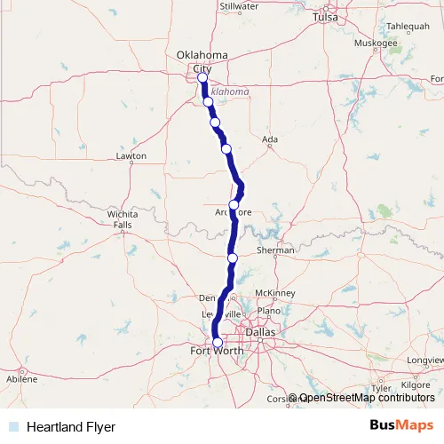 The first stop of the Heartland Flyer rail route is Oklahoma City and the last stop is Fort Worth. Heartland Flyer (Heartland Flyer) is operational during todos los días.