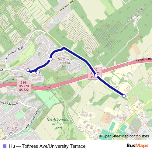 The first stop of the Hu bus route is 801 Toftrees Avenue - The Station and the last stop is Fox Hollow Rd at Orchard Rd Inbound. Hu (Toftrees Ave/University Terrace) is operational during entre semana.