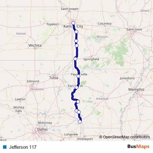 The first stop of the Jefferson 117 bus route is Kansas City and the last stop is Texarkana. Jefferson 117 is operational during todos los días.