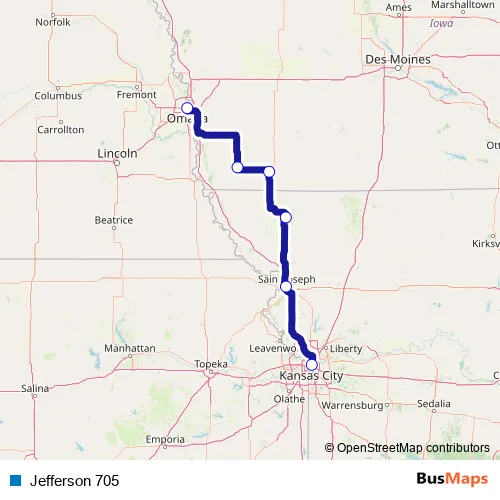 The first stop of the Jefferson 705 bus route is Kansas City and the last stop is Omaha. Jefferson 705 is operational during todos los días.