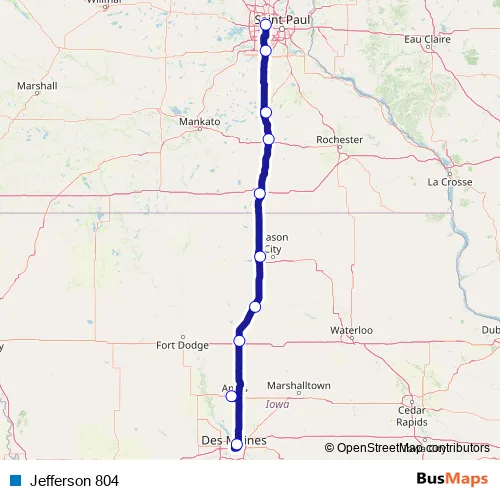 The first stop of the Jefferson 804 bus route is Des Moines and the last stop is Minneapolis. Jefferson 804 is operational during todos los días.