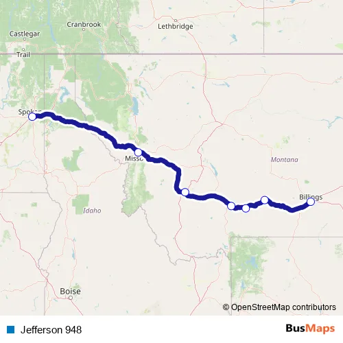 The first stop of the Jefferson 948 bus route is Spokane and the last stop is Billings. Jefferson 948 is operational during los fines de semana.