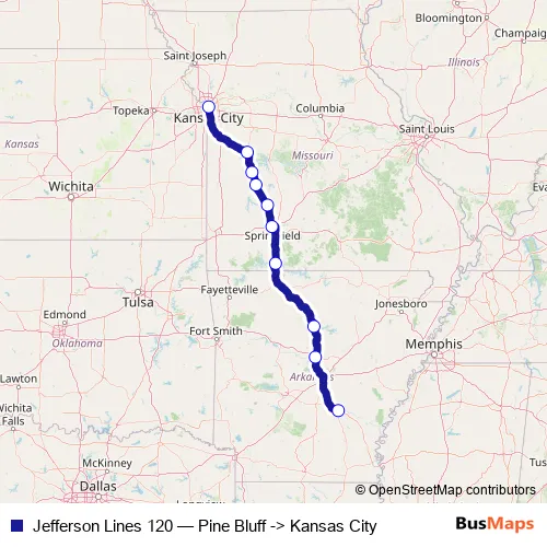 Click here to view the nearest Jefferson Lines 120 - Pine Bluff -> Kansas City bus stop.