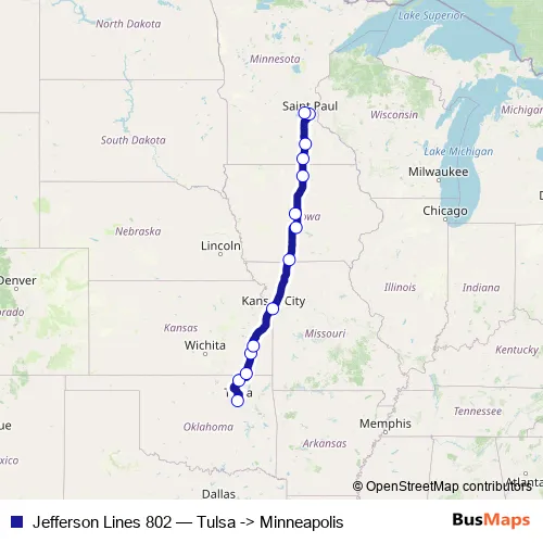 Click here to view the nearest Jefferson Lines 802 - Tulsa -> Minneapolis bus stop.