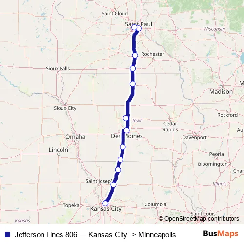 Click here to view the nearest Jefferson Lines 806 - Kansas City -> Minneapolis bus stop.
