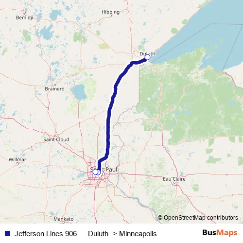 Click here to view the nearest Jefferson Lines 906 - Duluth -> Minneapolis bus stop.