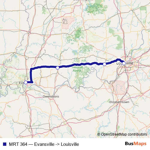 The first stop of the MRT 364 bus route is Evansville and the last stop is Louisville. MRT 364 (Evansville -> Louisville) is operational during todos los días.