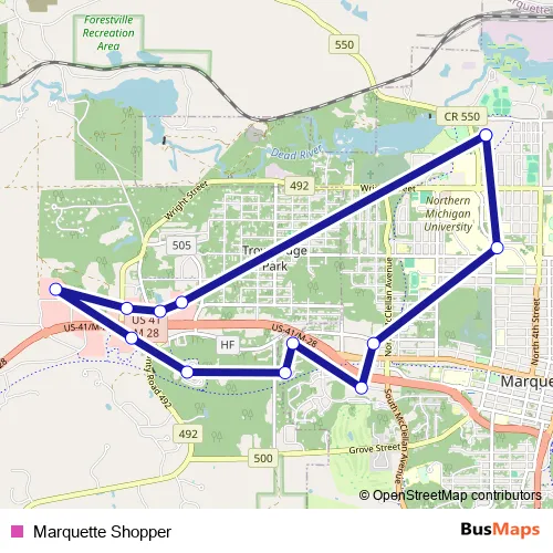 See why over 2 million users trust and consider busmaps.com as the best public transport website. busmaps gives you Marquette Buses suggested routes, real-time bus tracker, line route maps in Marquette, and helps to find the closest Marquette Shopper bus stops near you. No internet available? Download an offline PDF map and bus schedule for the Marquette Shopper bus to take on your trip.