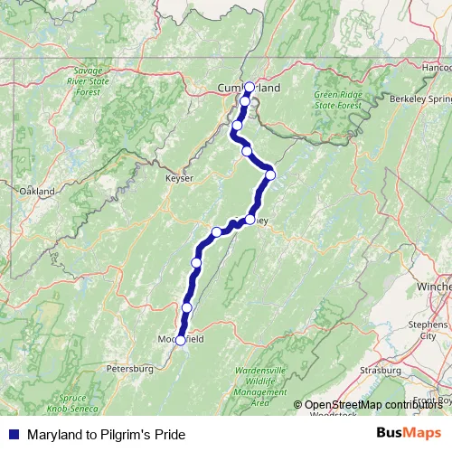The first stop of the Maryland to Pilgrim's Pride bus route is Roses Discount Store, call (304) 257-1414 for a 3/4 mile deviation and the last stop is Moorefield Pilgrim's Pride. Maryland to Pilgrim's Pride (Maryland to Pilgrim's Pride) is operational during todos los días.