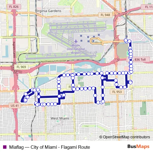 The first stop of the Miaflag bus route is Miami Intermodal Center and the last stop is Miami Intermodal Center. Miaflag (City of Miami - Flagami Route) is operational during todos los días.