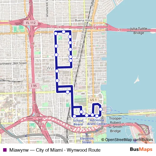 The first stop of the Miawynw bus route is Adrienne Arsht Center Metromover Station and the last stop is Adrienne Arsht Center Metromover Station. Miawynw (City of Miami - Wynwood Route) is operational during todos los días.