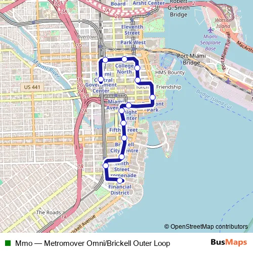 The first stop of the Mmo tram route is Financial District Metromover Station and the last stop is Government Center Metromover Station. Mmo (Metromover Omni/Brickell Outer Loop) is operational during todos los días.