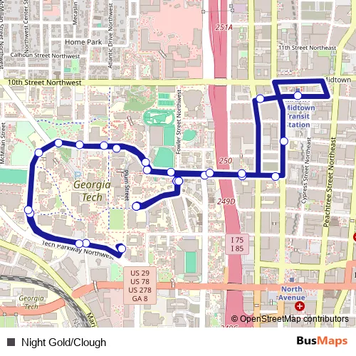 The first stop of the Night Gold/Clough bus route is Weber Building Loop and the last stop is Ferst Drive & Student Center. Night Gold/Clough (Night Gold/Clough) is operational during todos los días.