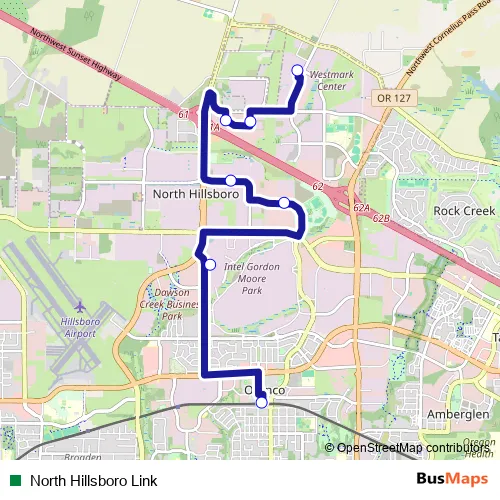 The first stop of the North Hillsboro Link bus route is Orenco MAX Station (Trimet stop) and the last stop is Westmark Center (6999 NE Century Blvd). North Hillsboro Link (North Hillsboro Link) is operational during todos los días.