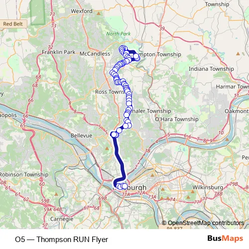 The first stop of the O5 bus route is Peebles RD + Sample and the last stop is Seventh AVE + William Penn Pl. O5 (Thompson RUN Flyer) is operational during entre semana.