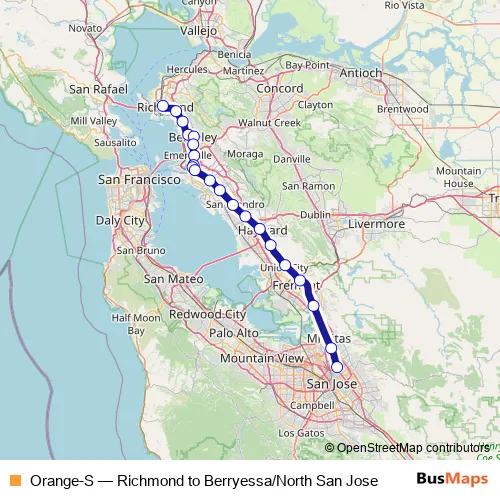 The first stop of the Orange-S metro route is Richmond and the last stop is Berryessa / North San Jose. Orange-S (Richmond to Berryessa/North San Jose) is operational during todos los días.