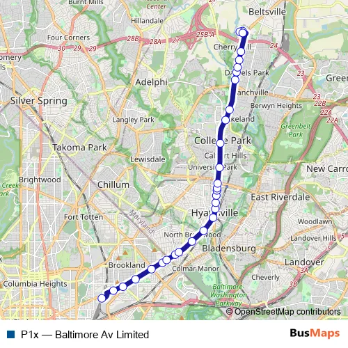 The first stop of the P1x bus route is Rhode Island Av-Brentwood+Bay D and the last stop is Ikea Way+Bus Bay 3. P1x (Baltimore Av Limited) is operational during todos los días.