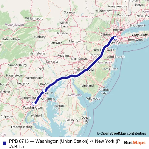Click here to view the nearest PPB 8713 - Washington (Union Station) -> New York (P.A.B.T.) bus stop.