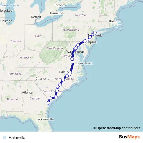The first stop of the Palmetto rail route is Savannah and the last stop is Ny Moynihan Train Hall At Penn Station. Palmetto is operational during todos los días.
