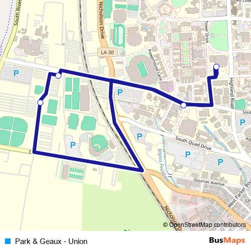 The first stop of the Park & Geaux - Union bus route is Lot 406 and the last stop is Tiger Park South. Park & Geaux - Union (Park & Geaux - Union) is operational during entre semana.