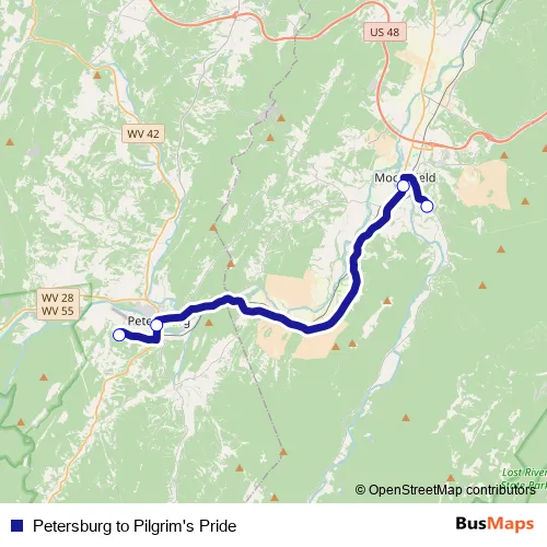 The first stop of the Petersburg to Pilgrim's Pride bus route is Woodland Terrace, call (304) 257-1414 for a 3/4 mile deviation and the last stop is Misty Terrace, Moorefield. Petersburg to Pilgrim's Pride (Petersburg to Pilgrim's Pride) is operational during todos los días.