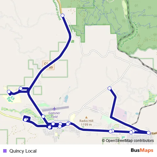 The first stop of the Quincy Local bus route is 529 Bell Ln (Drop In Center) and the last stop is Hwy 70 at Mill Creek Rd. Quincy Local is operational during entre semana.