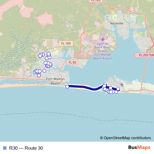 The first stop of the R30 bus route is Santa Rosa Mall and the last stop is NW FL State College/UWF (Transfer Location). R30 (Route 30) is operational during entre semana.