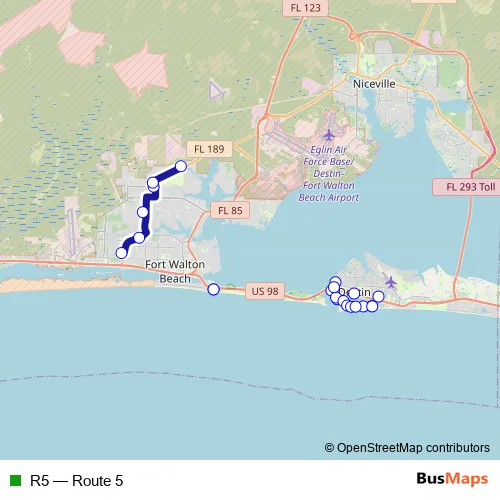 See why over 2 million users trust and consider busmaps.com as the best public transport website. busmaps gives you Destin Buses suggested routes, real-time bus tracker, line route maps in Destin, and helps to find the closest R5 bus stops near you. No internet available? Download an offline PDF map and bus schedule for the R5 bus to take on your trip.