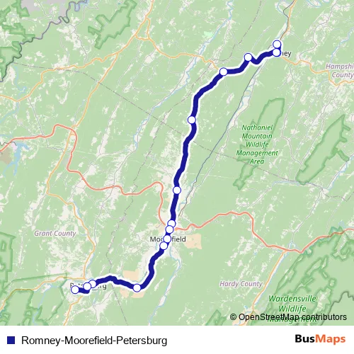 Additional information: Romney-Moorefield-Petersburg has 15 stops and the total trip duration for this route is approximately 102 minutes.