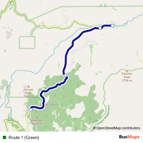 The first stop of the Route 1 (Green) bus route is Lodgepole Campground and the last stop is Giant Forest Museum. Route 1 (Green) (Route 1 (Green)) is operational during todos los días.