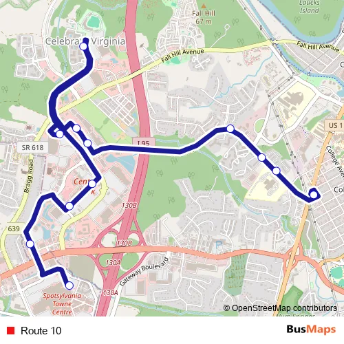 The first stop of the Route 10 bus route is 1 - Fxbgo! Central and the last stop is 19 - Spotsylvania Towne Centre (Guitar Center). Route 10 is operational during entre semana.