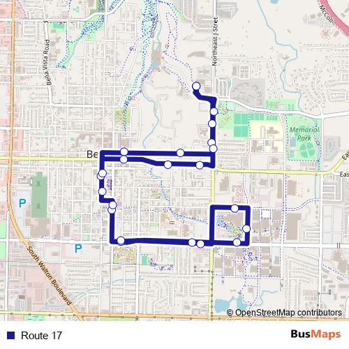 The first stop of the Route 17 bus route is Crystal Bridges Campus Parking and the last stop is Crystal Bridges Campus Parking. Route 17 is operational during todos los días.