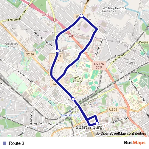 The first stop of the Route 3 bus route is Downtown and the last stop is N. Church Street & Wofford College. Route 3 is operational during todos los días.