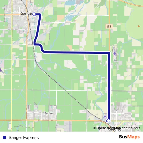 The first stop of the Sanger Express bus route is Reedley College and the last stop is Sanger Community Center. Sanger Express (Sanger Express) is operational during entre semana.