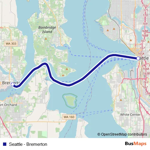 See why over 2 million users trust and consider busmaps.com as the best public transport website. busmaps gives you Seattle Ferries suggested routes, real-time bus tracker, line route maps in Seattle, and helps to find the closest Seattle - Bremerton ferry stops near you. No internet available? Download an offline PDF map and bus schedule for the Seattle - Bremerton ferry to take on your trip.