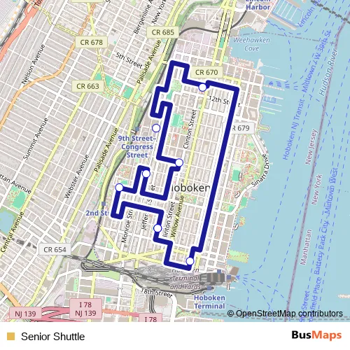 See why over 2 million users trust and consider busmaps.com as the best public transport website. busmaps gives you Jersey City Buses suggested routes, real-time bus tracker, line route maps in Jersey City, and helps to find the closest Senior Shuttle bus stops near you. No internet available? Download an offline PDF map and bus schedule for the Senior Shuttle bus to take on your trip.